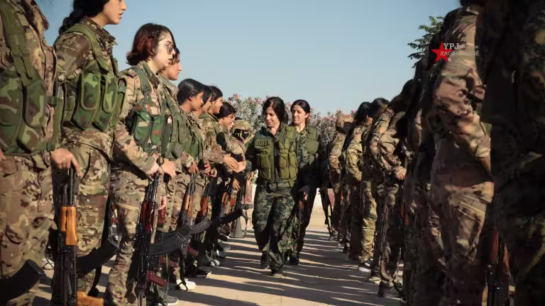 Today, on the anniversary of the two contemporary fighters who gave their lives in the heart of fascism in Kobanî, the Women’s Protection Units (YPJ) commemorated the path of Rivana Rojava and Arîn Mîrkan with a military ceremony in the city of Hasakah. The YPJ renewed the spirit of its martyrs and reaffirmed the pledge made to their people and comrades.