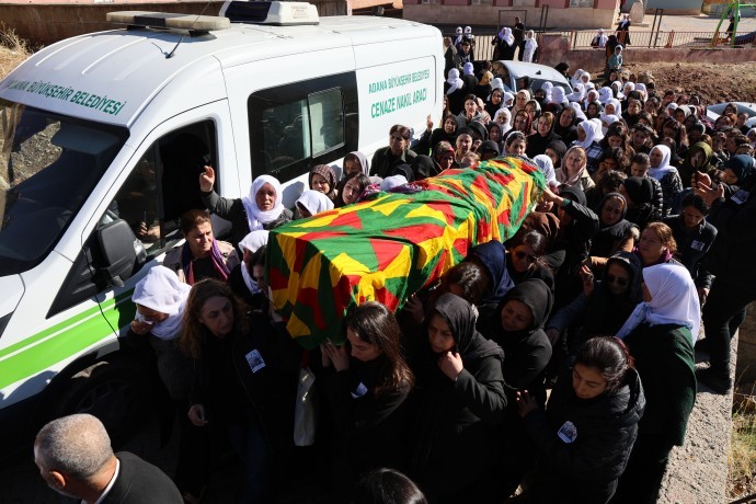 On Tuesday, Kutlu’s body was transferred from Adana to Şırnak. The funeral procession was met by women along the way—first in Mardin, then in Cizre. Hundreds accompanied the convoy to the village of Navyan, where Kutlu had grown up. Several thousand people gathered in the village, including the co-chair of the DEM Party, Tülay Hatimoğulları.
