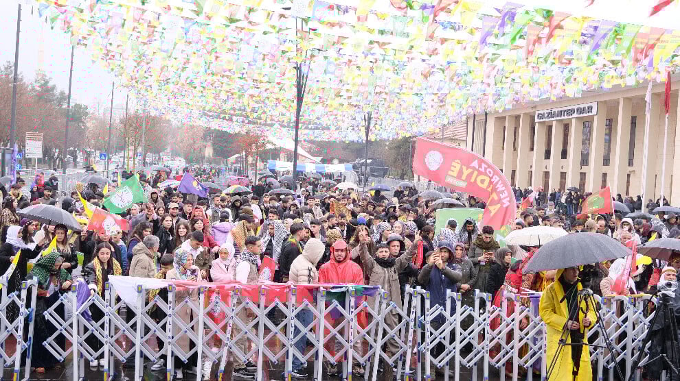Despite heavy rain, masses attended the Newroz celebration in Antep’s İstasyon Square, displaying banners featuring photos of Abdullah Öcalan and placards demanding his physical freedom.